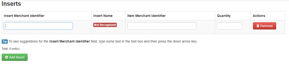 3. Enter then name of the insert you wish to add in the Insert Merchant Identifier field and quantity in the quantity field. If you are unsure of your insert name you can find a list of all your inserts here: