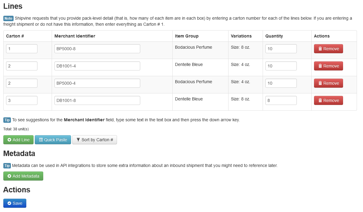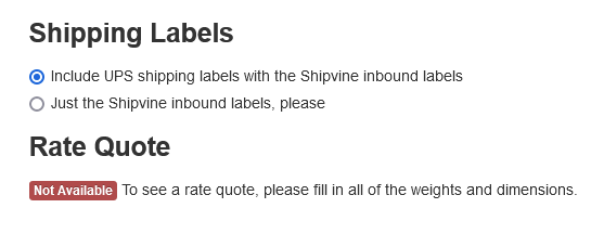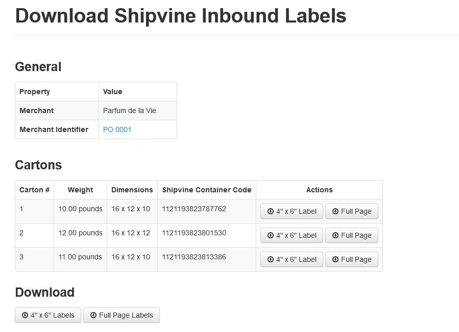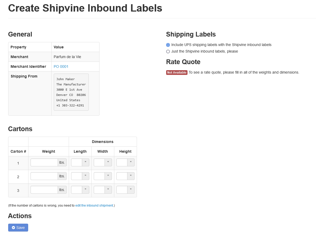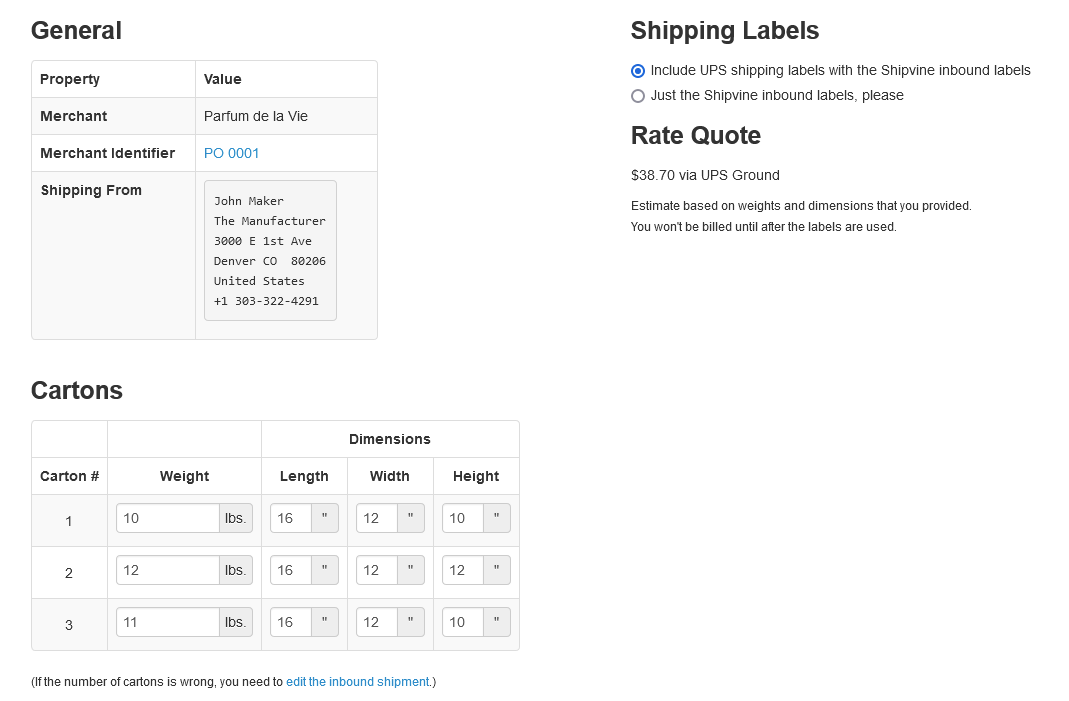 ^ Entering carton weights and dimensions is only necessary if you are generating shipping labels, as this information is required by the carrier service. If you are only printing Shipvine Inbound Labels, this information is not necessary and can be left blank.