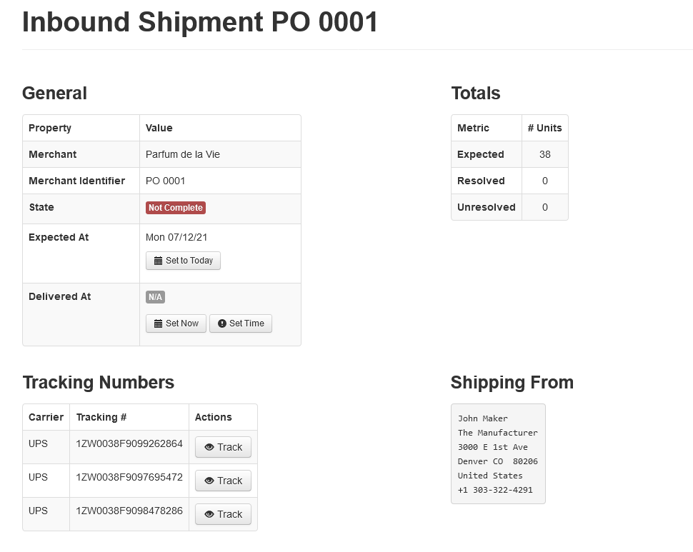 ^ As you can see, the Merchant’s Purchase Order number for this Inbound Shipment is “PO 0001” and the Shipping From (address of manufacturer or “return address”) information for the cartons is filled out on the right. No tracking information is currently available for this shipment.