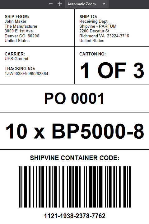 The shipping label that is generated is a standard UPS Ground shipping label. You can see all the information that was previous entered, appears here (the “Shipping From” address at the top left, the “Ship To” address automatically filled in with Shipvine’s address, a reference to the Receiving Dept and the company the shipment is for, along with a reference to the Inbound Shipment at the bottom of the label, and the number of cartons expected in the shipment):