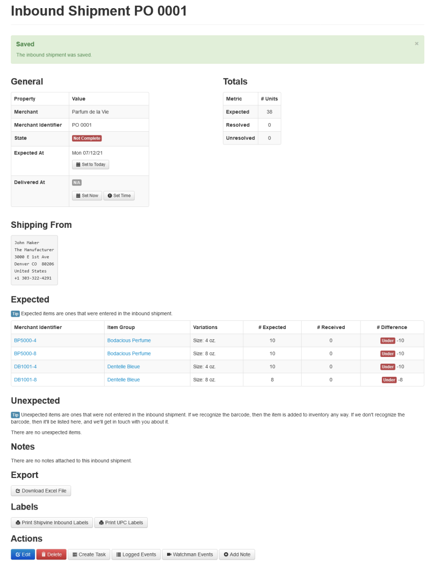 Below, is an example of an Inbound Shipment being created for an example company called “Parfum de la Vie”: