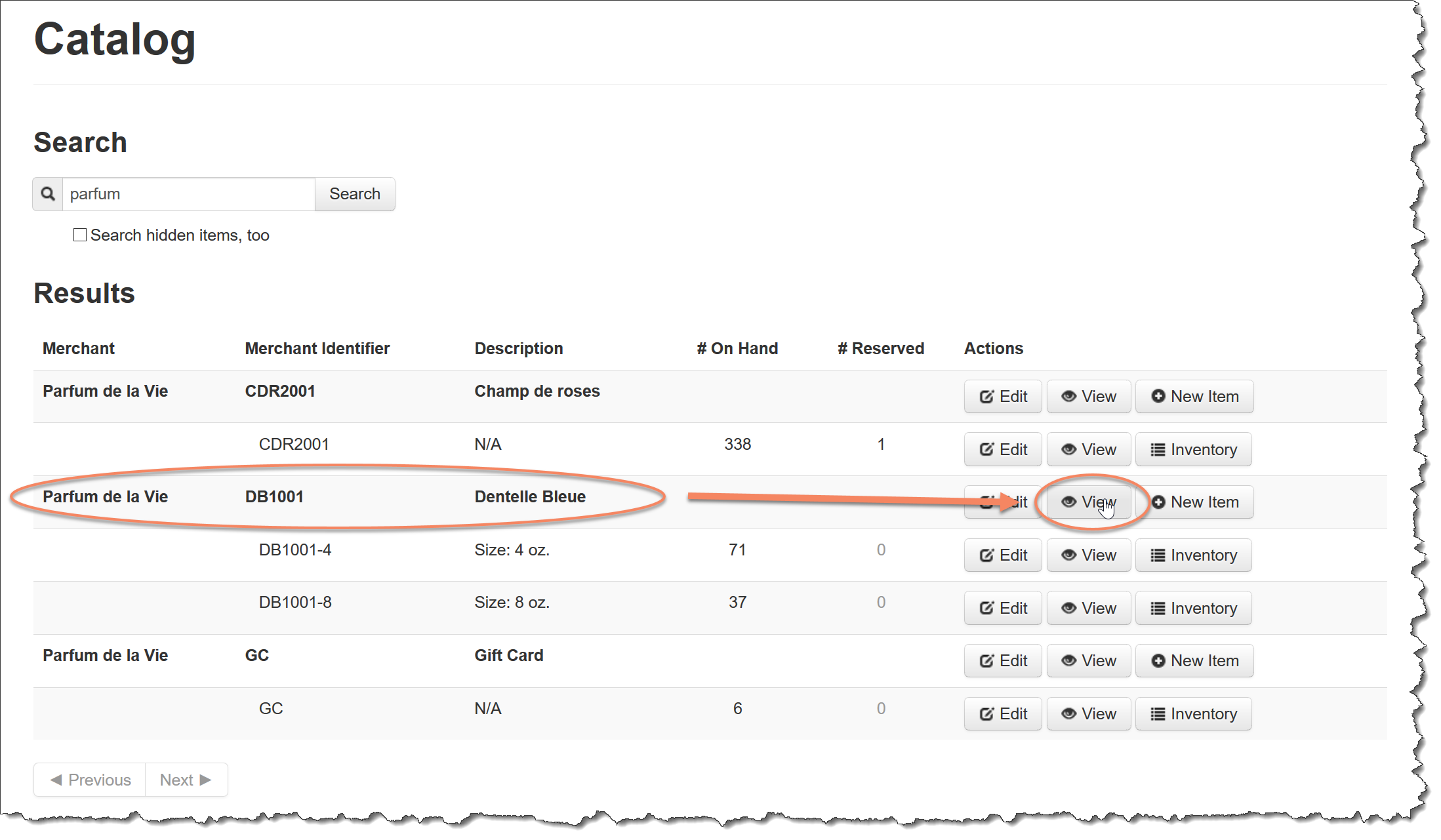 2. Search or browse for the item that you'd like to update by typing its SKU or name into the Search box, and then press enter:
