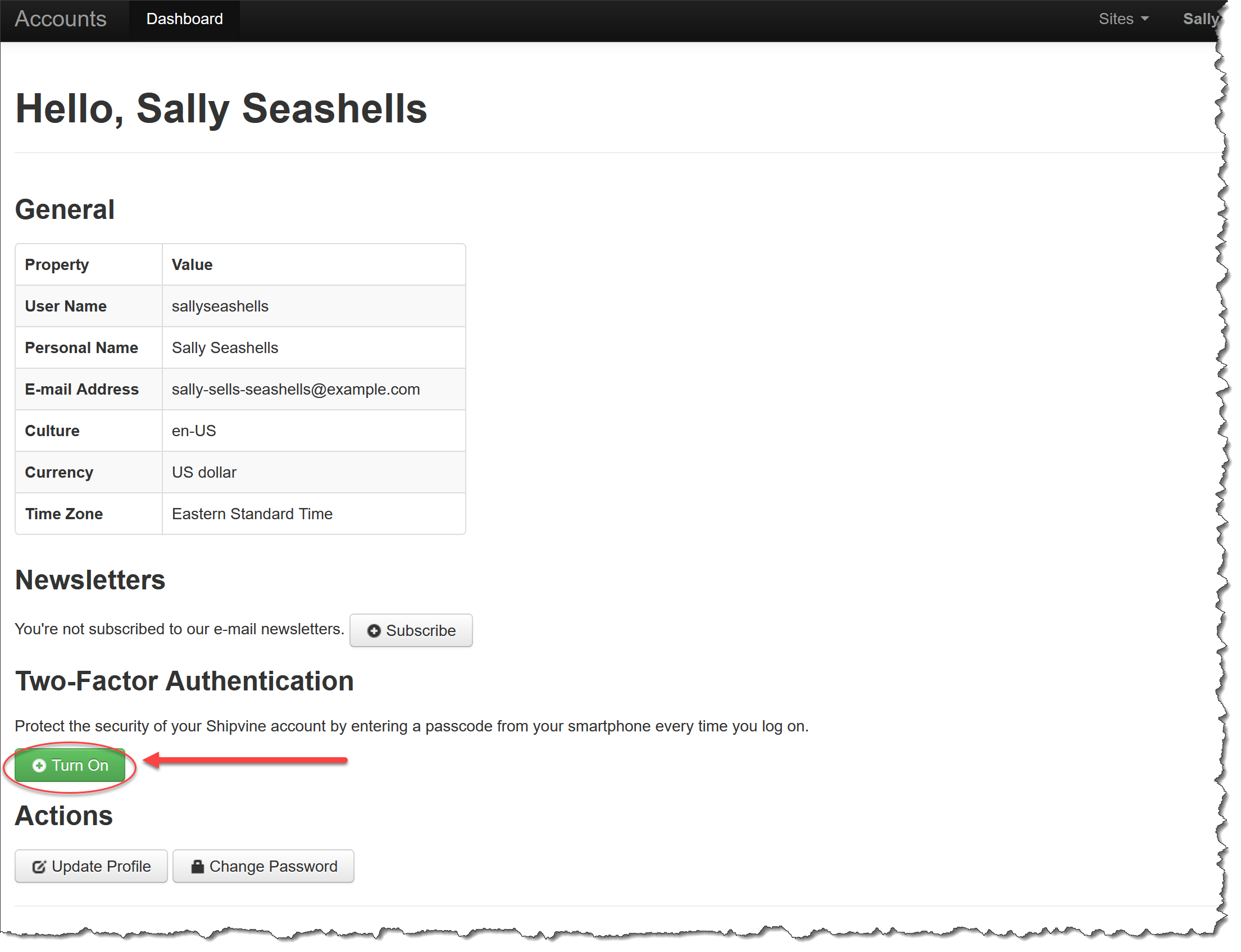 Shipvine Accounts Dashboard and look for the green "Turn On" button under the "Two-Factor Authentication" section.