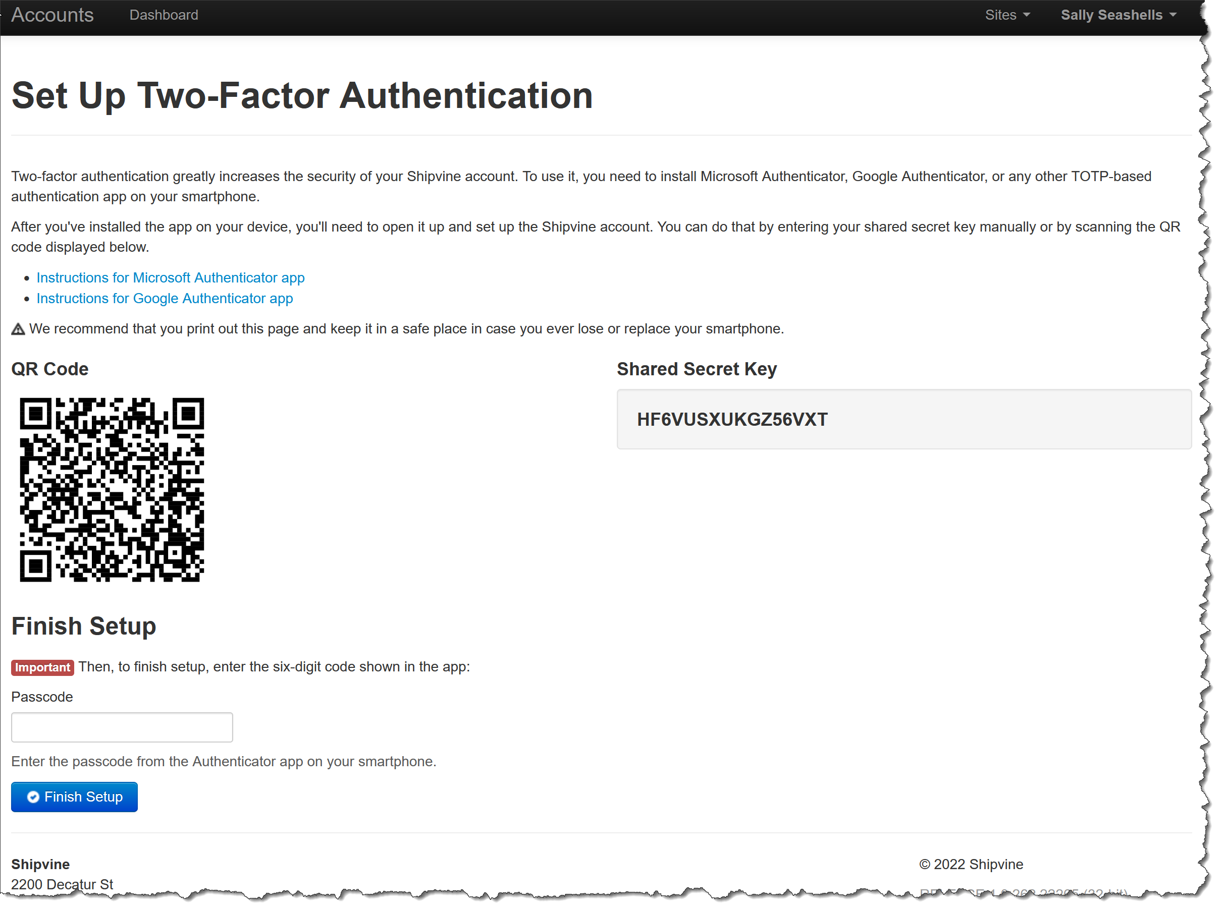 Enabling two-factor authentication greatly increases the security of your Shipvine account and is required for account owners to be able to manage other users. It works by requiring you to enter a constantly-changing code from an app on your smartphone whenever you log into Shipvine with your normal user name and password.