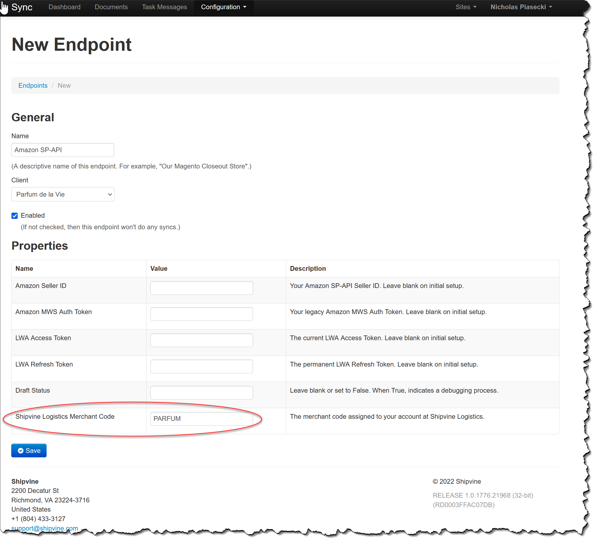New Amazon SP-API Integration page. Under Properties, paste in your "Shipvine Logistics Merchant Code" that was provided to you by Shipvine Support. You can leave all the rest of the fields blank.